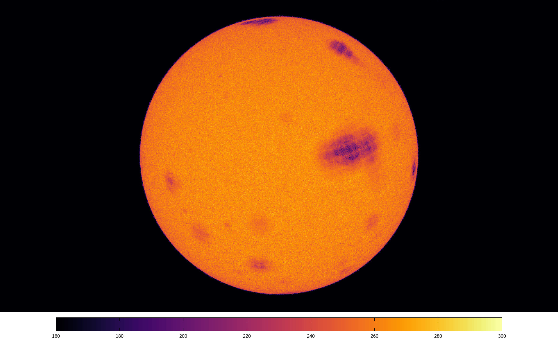 Brightness temperature, in Kelvins of the random01 dataset. Cold zones (in altitude) or highly reflective (i.e. weakly emitting) zones are made visible because of their lower specific intensity.