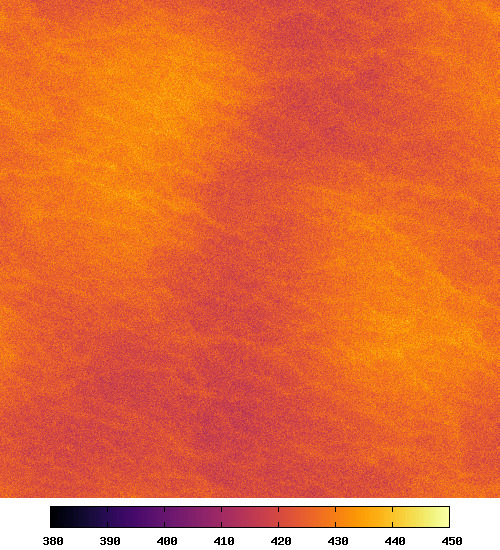 Longwave downward flux density maps in W/m² computed on the same scene of the previous image. The spectral integration ranges is [4, 100] µm. Its spatially-avaraged is 425.159 W/m². Note the effect of clouds (higher values, due to the emission by the base of the cloud at higher temperatures than for a clear-sky zone) and also a "ripple" effect that is due to the spatial variations of water vapor concentration, as provided by the LES simulation.