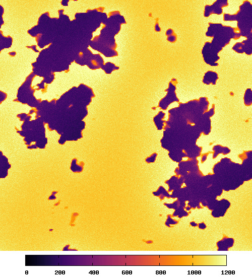 Shortwave downward flux density maps in W/m² computed by htrdr-atmosphere at 1 meter height with the DZVAR cloud field. The sun is located at the zenith. The spectral integration range is [0.38, 4] µm . Its spatially-avaraged flux is 879.349 W/m² . One can observe the contrast between the shadows of the clouds and fully illuminated areas.