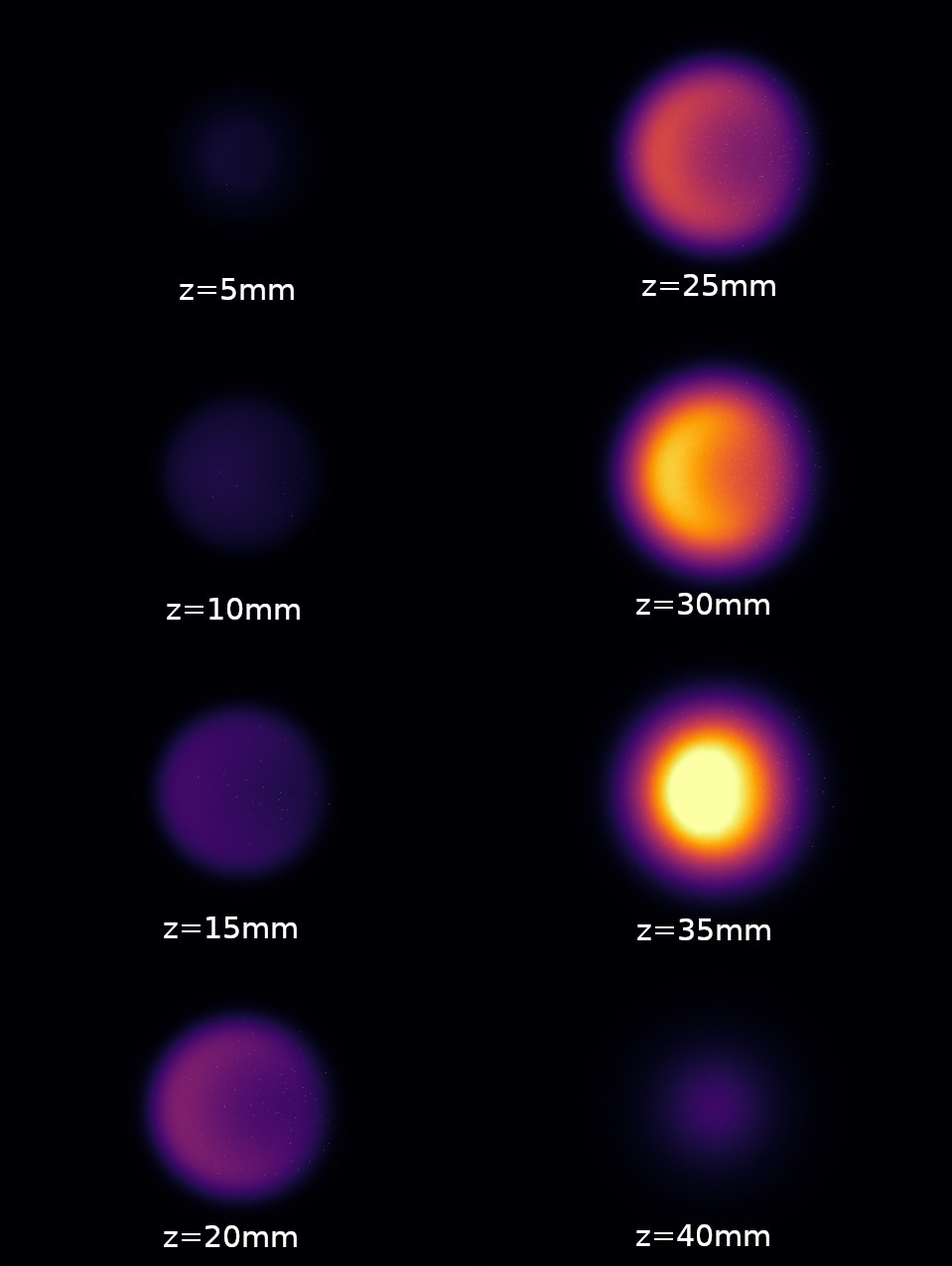 Renderings in the visible range calculated by htrdr-combustion of a laminar sooting flame seen from above and illuminated by a laser sheet. The images display radiation that is emitted by the laser, scattered and transmitted by the combustion medium. The laser sheet is horizontal, and intersects the medium at various heights. One can see the difference in the scattered signal between the left and right parts of the image; since the laser propagates from the left to the right, it is progressively attenuated while traveling the medium. The intensity of radiation subject to scattering therefore decreases. In addition to these trapping effect these images provide some insight about the scattering cross-section of the medium as a function of height. Scattering properties of soot gradually increase from the injection position to a height of approximately 35 mm. A steep decrease follows: the image for a height of 40 mm is very similar to the image obtained at 10 mm.