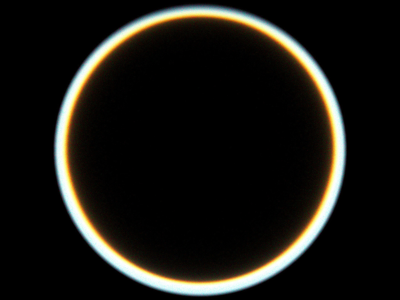 Rendering of Titan in transit situation, i.e. the source is positioned behind Titan to simulate a solar eclipse by Titan.