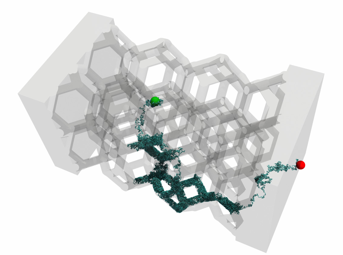 Example of conductive path sampled by Stardis in a foam geometry: it starts from the probe position (green point) and after several diffusive steps reaches a boundary condition (red point).
