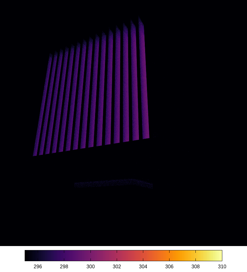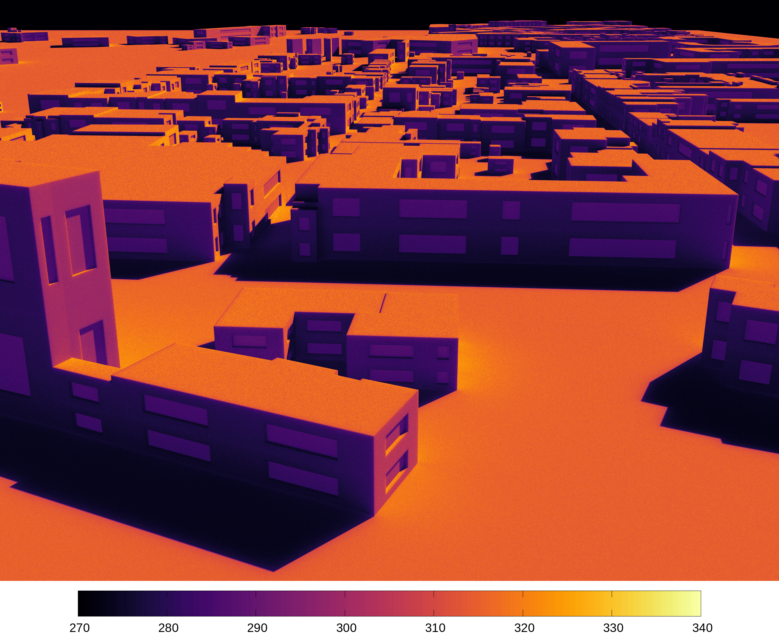 Infrared rendering by Stardis of a city district generated by City_Generator2 from the cadastral map of Ile du Ramier in Toulouse, France. Temperature are given in Kelvin. The coupled exchanges of convection, conduction and radiation are evaluated within and between all buildings, i.e. in each room, through every pane of glass and wall with insulation, via the floor, etc. Note that shadows are "heat" shadows produced by the sun defined as an external source boundary condition.