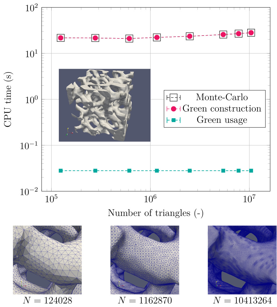 Stardis computation time as function of geometrical refinement. Both the standard Monte Carlo computation and the Green function construction and usage are insensitive. In this example, once constructed, using the Green function with any new set of sources is 10³ times faster than Monte Carlo.